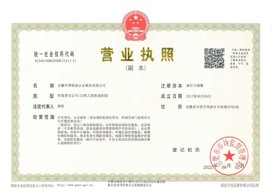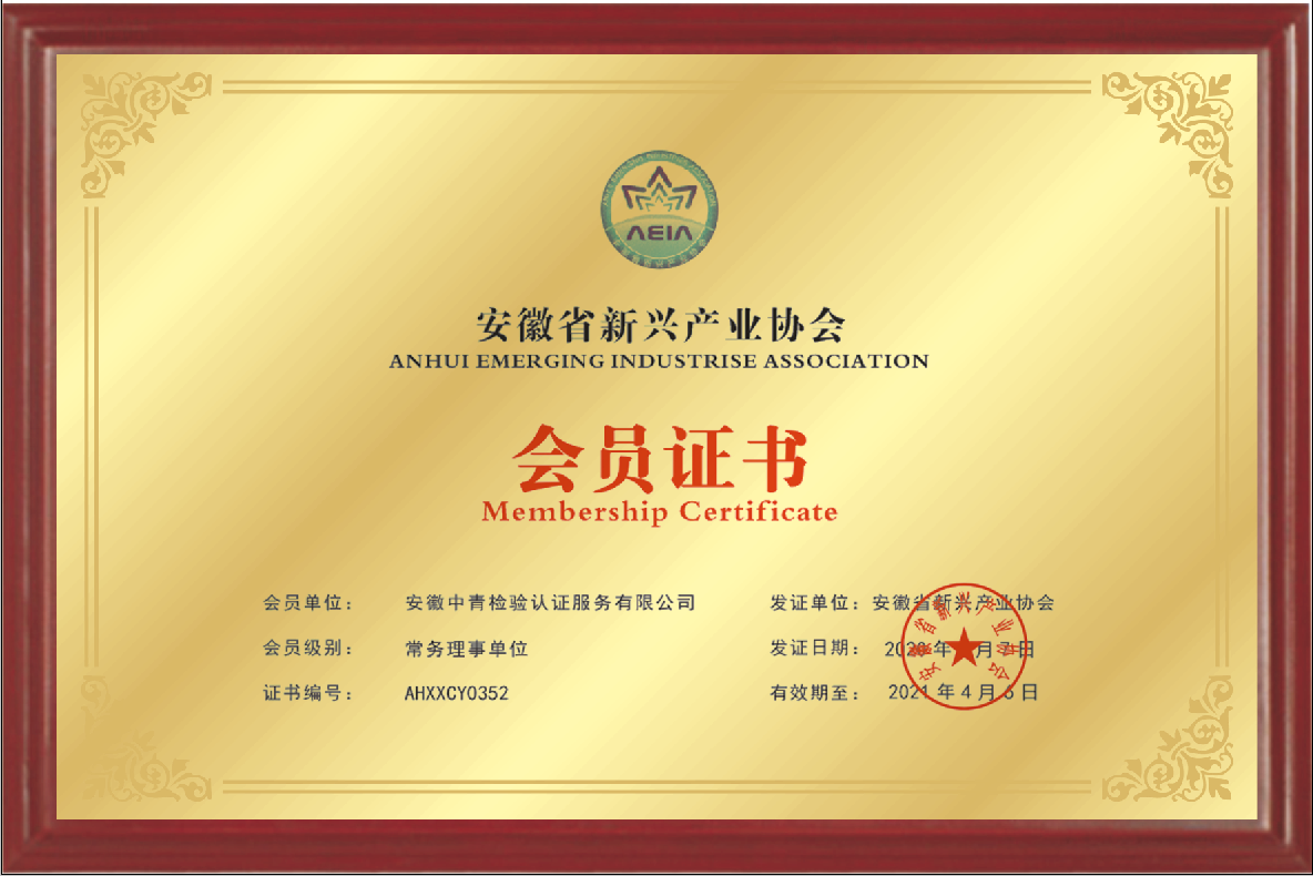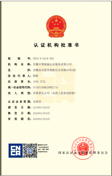 安徽中青檢驗(yàn)認(rèn)證服務(wù)有限公司成立于2017年6月6日,2018年1月3日通過國(guó)家認(rèn)證認(rèn)可監(jiān)督管理委員會(huì)批準(zhǔn),現(xiàn)認(rèn)證領(lǐng)域:質(zhì)量管理體系、環(huán)境管理體系、職業(yè)健康安全管理體系、食品安全管理體系、HACCP管理體系、有機(jī)產(chǎn)品認(rèn)證、良好農(nóng)業(yè)規(guī)范、服務(wù)體系、醫(yī)療器械質(zhì)量管理體系、企業(yè)誠(chéng)信管理體系、食品工業(yè)企業(yè)誠(chéng)信管理體系、食安安徽品牌等類別認(rèn)證。
